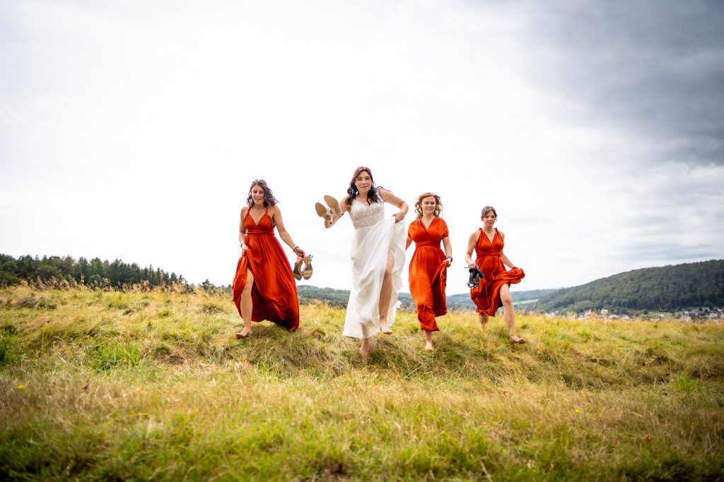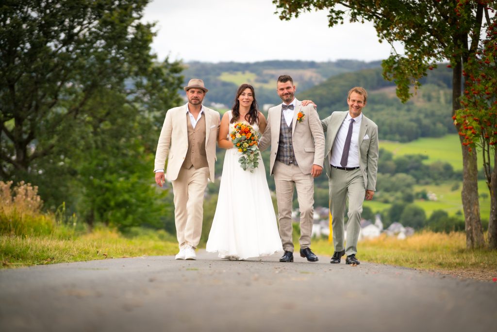 In meiner Hochzeitsfotografie im Raum Burbach lege ich großen Wert darauf, dass jedes Paar seine Geschichte in den Bildern wiederfindet. Für dieses Brautpaar war die Kulisse mehr als nur eine schöne Aussicht – sie zeigt ihre gemeinsame Herkunft aus dem Hickengrund. Die vertraute Landschaft im Hintergrund symbolisiert ihre Wurzeln und Verbundenheit. Besonders wichtig war dem Paar, auch Trauzeugen und Brautjungfern beim offiziellen Shooting dabeizuhaben, um die Nähe und Freude dieses besonderen Tages festzuhalten. So entstehen authentische Hochzeitsfotos aus dem Siegerland, die die Geschichte des Paares lebendig machen.